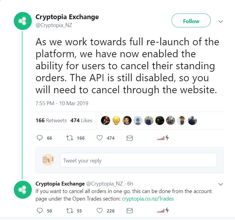 The Newzealand based cryptocurrency exchange Cryptopia enables ‘Cancel Order’ for all users. Cryptopia announced this by a Twitter post on 10 March.