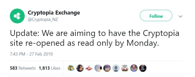Newzealand based cryptocurrency exchange Cryptopia will reopen before the next Monday i.e before 4 March. Cryptopia officially announced that via a tweet.