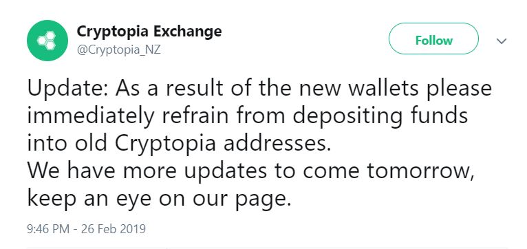 Cryptopia updated that users must stop depositing funds to the old wallets. Users must create new deposit addresses before depositing.