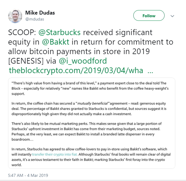 Starbucks received significant equity in Bakkt in return for a commitment to allow bitcoin payments in store in 2019 [GENESIS] via i_woodford reported by The Block Crypto on 4 March 2019.